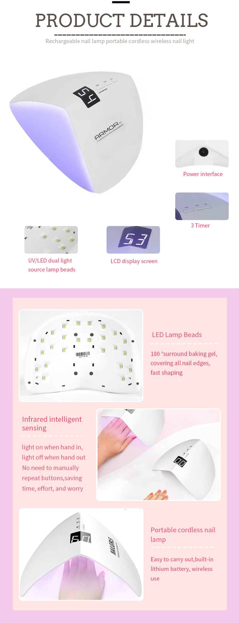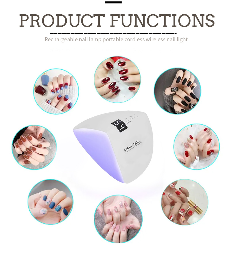 Produktet sikrer til og med limtørking uten krymping. Dens doble lyskilder gir mild oppvarming for å forhindre misfarging av hånd og øyestamme, egnet for både hender og føtter, og gir bemerkelsesverdig raskt tørkende resultater.