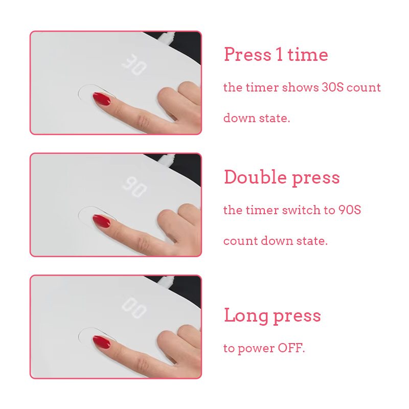 Den sammenleggbare mini-negletørkelampen har infrarød smart sensorteknologi som automatisk tennes når hendene nærmer seg og slås av når hendene beveger seg bort – noe som eliminerer bryet med å trykke gjentatte ganger på knapper og sparer tid og krefter. Høyeffekt bakelim krever ingen lang ventetid, og sparer både tid og krefter.