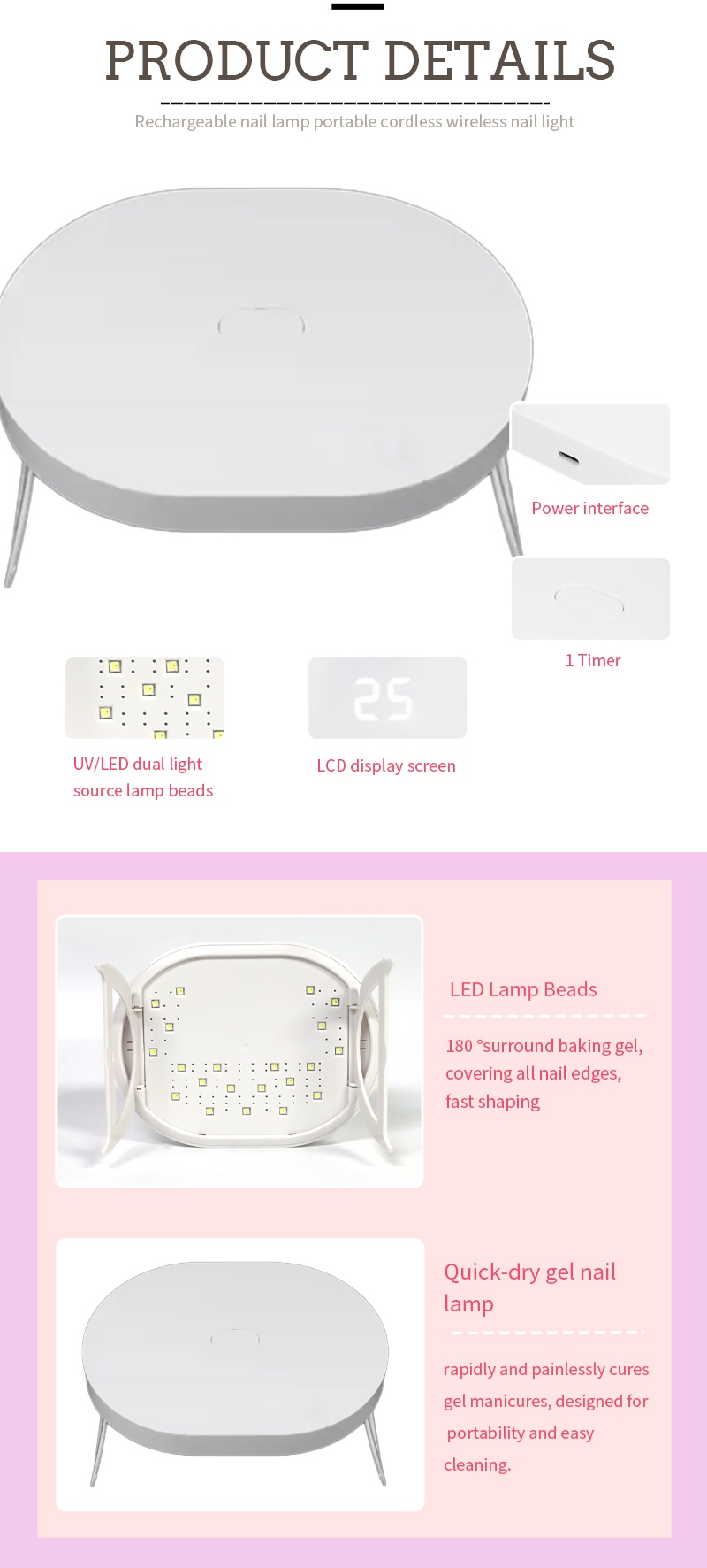Den sammenleggbare mini-negletørkelampen sikrer jevn limtørking uten krymping. De doble lyskildene gir skånsom oppvarming for å forhindre misfarging av hender og belastning på øynene, egnet for både hender og føtter, og gir bemerkelsesverdig raskt tørkende resultater.