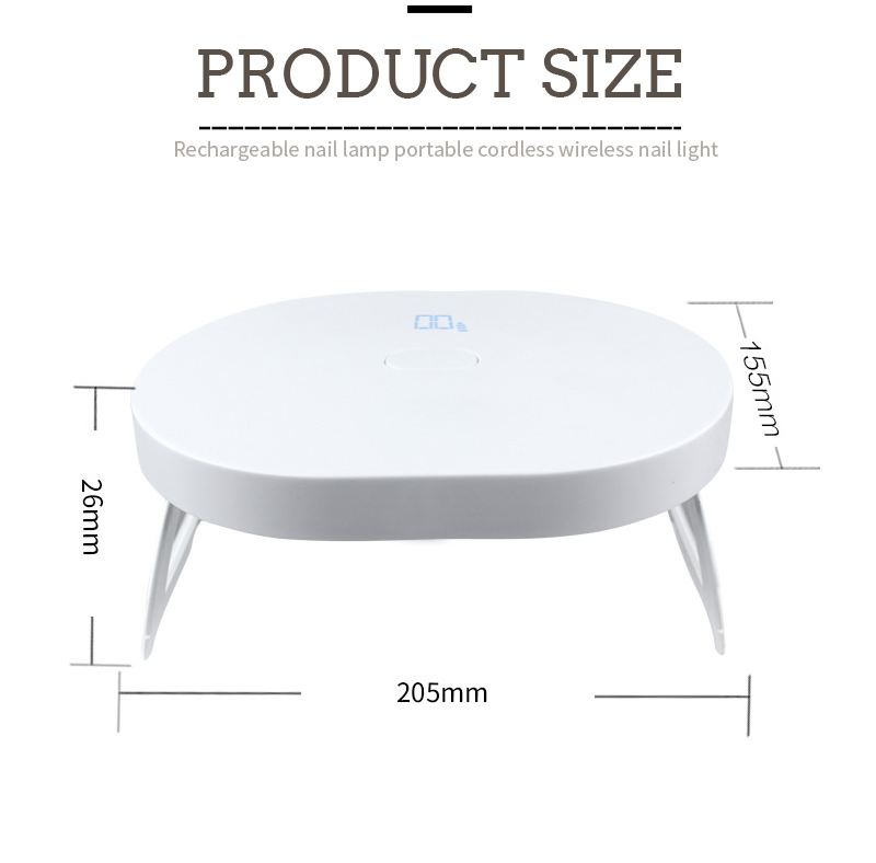 Dimensjonene til den sammenleggbare mini spikertørkelampen er 205 mm i lengde, 155 mm i bredden og 26 mm i høyden, med stor kapasitet og mulighet til å bruke både hender og føtter, noe som er veldig praktisk.