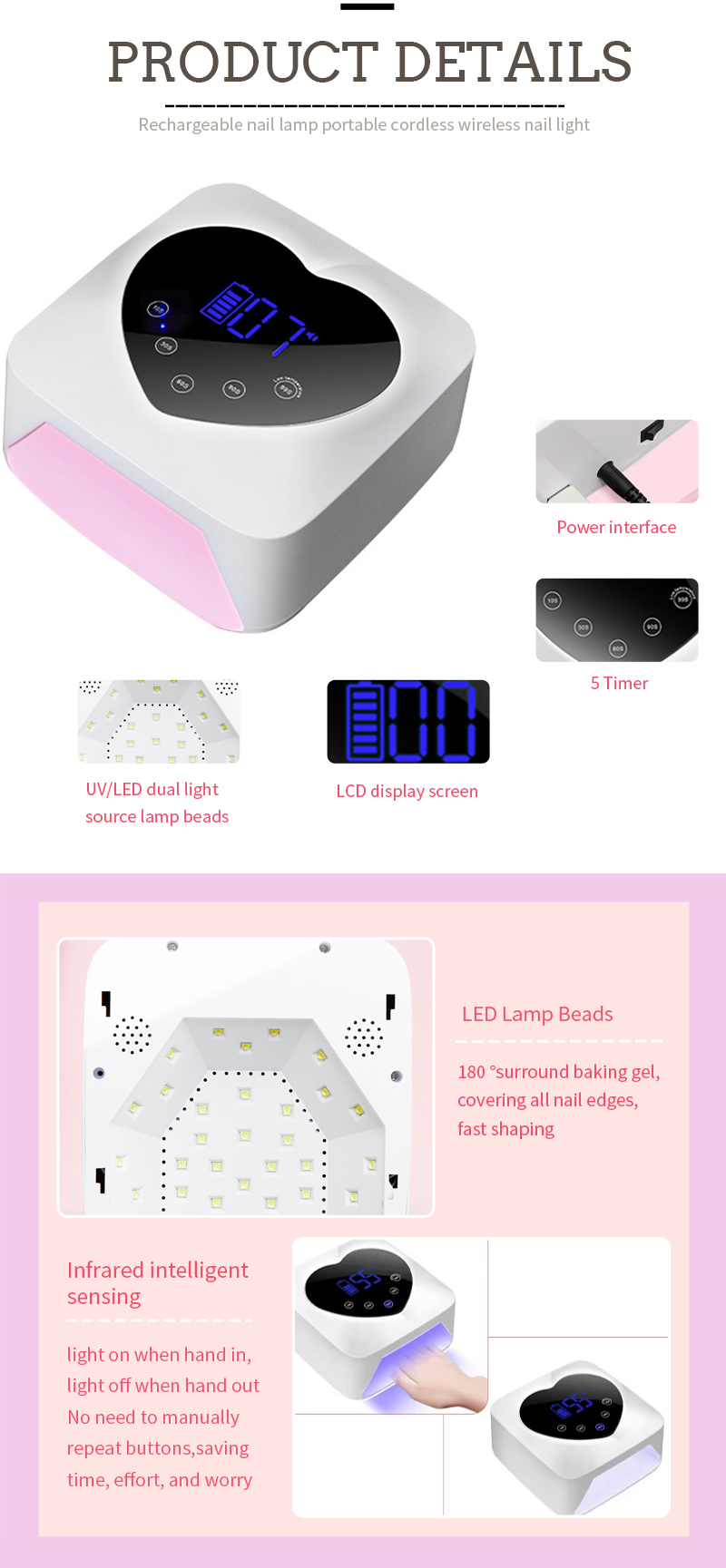 Produktet sikrer til og med limtørking uten krymping. Dens doble lyskilder gir mild oppvarming for å forhindre misfarging av hånd og øyestamme, egnet for både hender og føtter, og gir bemerkelsesverdig raskt tørkende resultater.