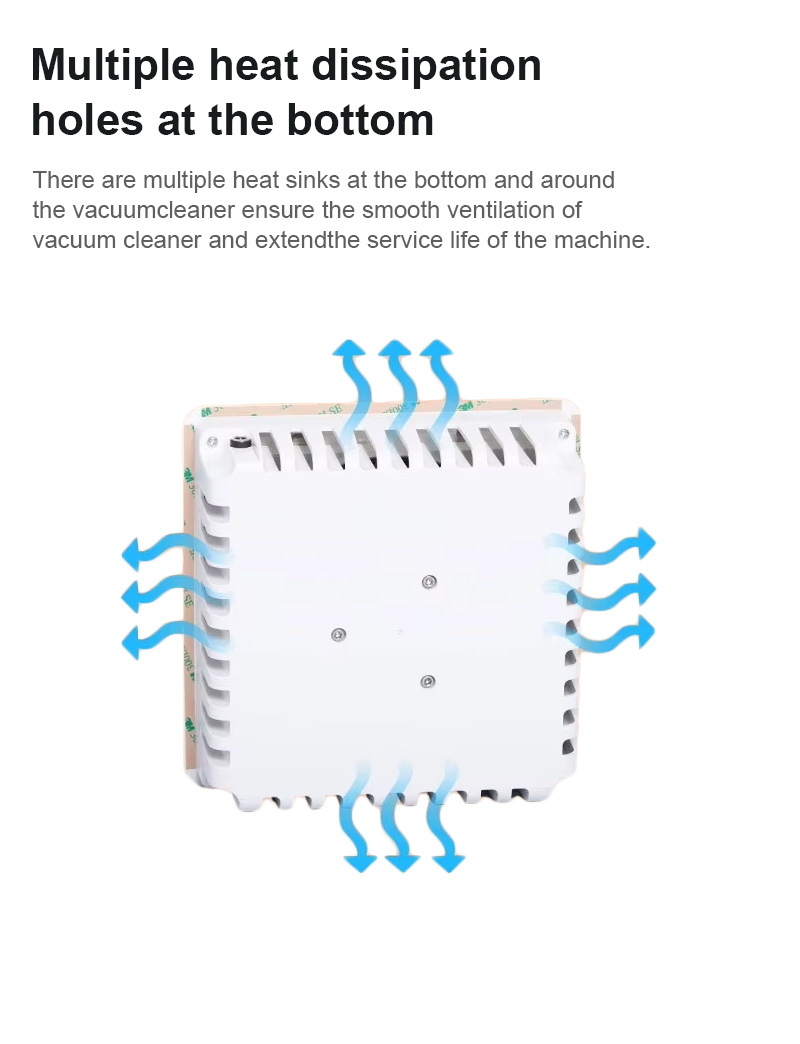 Bunnen av produktet har kjølehull for jevn ventilasjon, og støvsugeren er designet med flere kjøleventiler på bunnen og rundt for å sikre jevn ventilasjon og forlenge levetiden til maskinen.