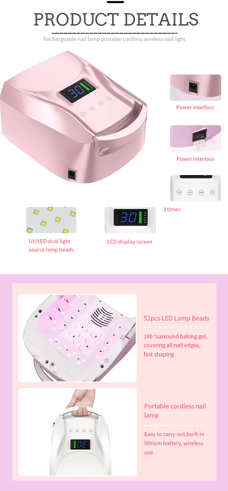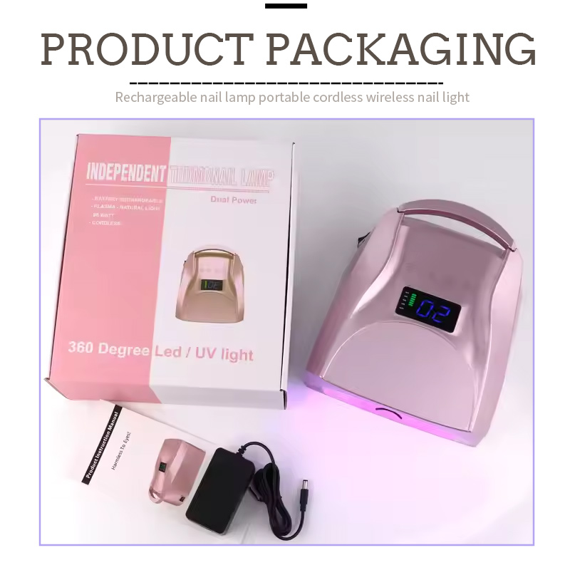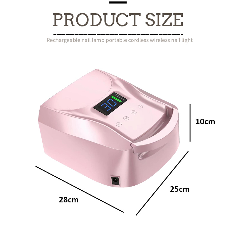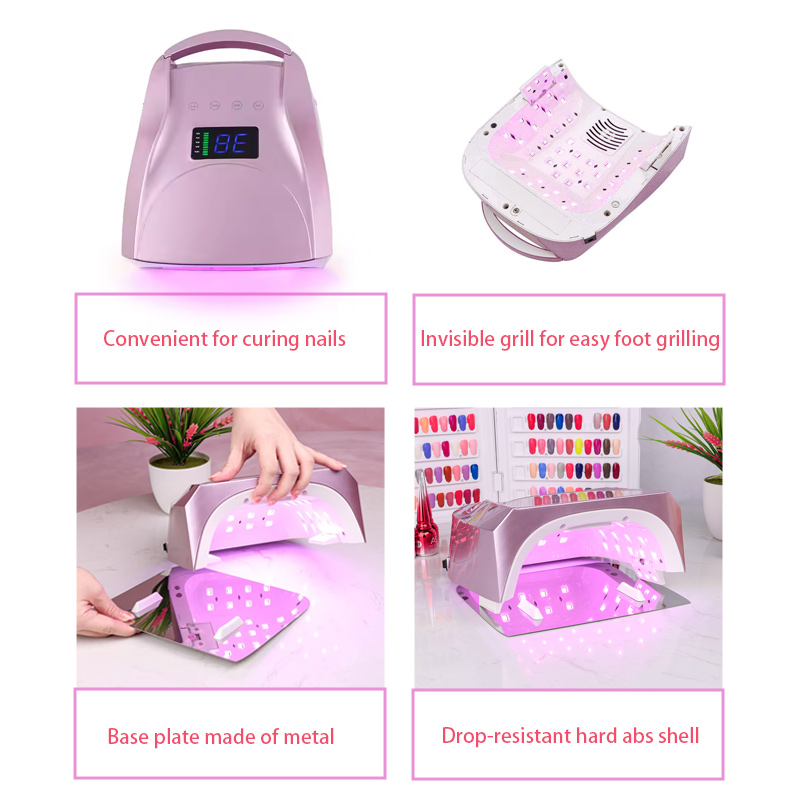 Oppladbar neglelakk Lampe Profesjonell versjon 96W Produktutseende har en Groove -design, håndtaket i sporet kan brukes som en bærbar håndtakrolle, noe som gjør det mer praktisk å bære og sette. Det unngår også ulempen med at håndtaket lett blir ødelagt og trakk løs.