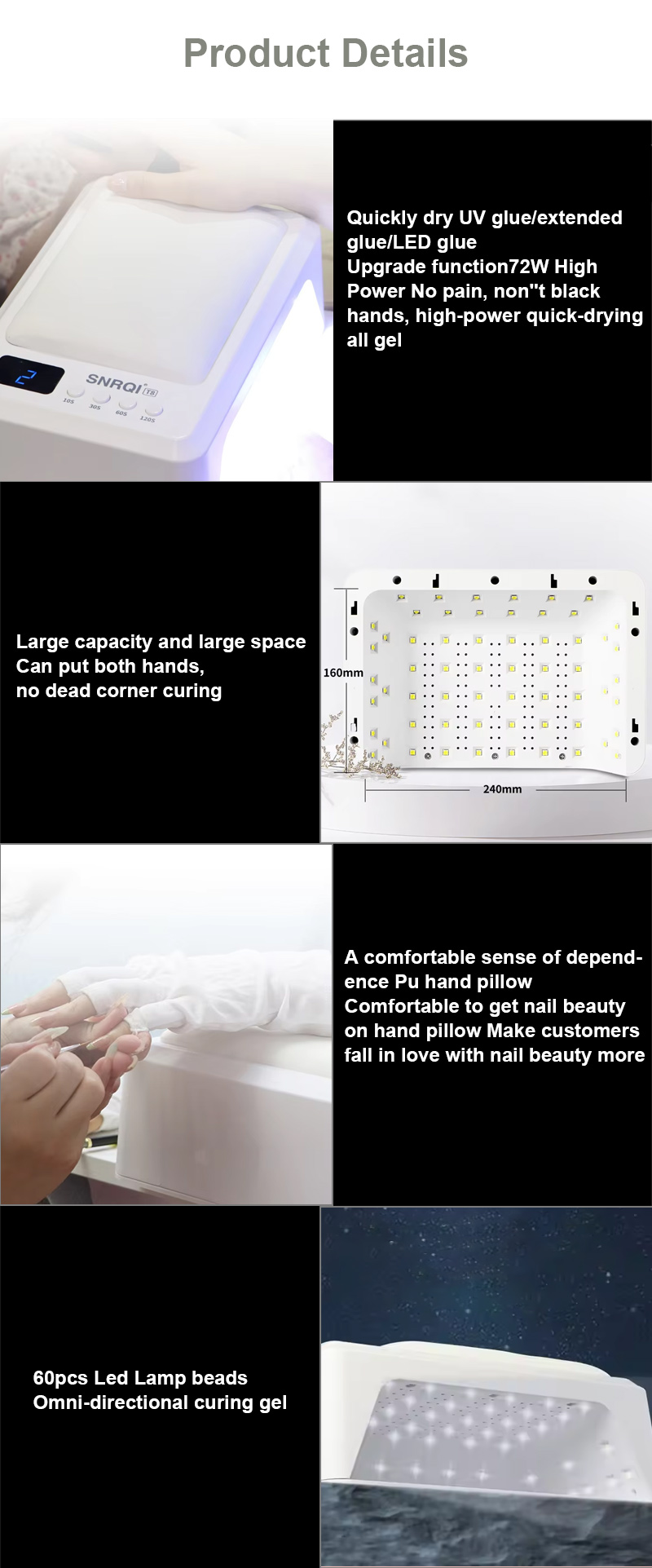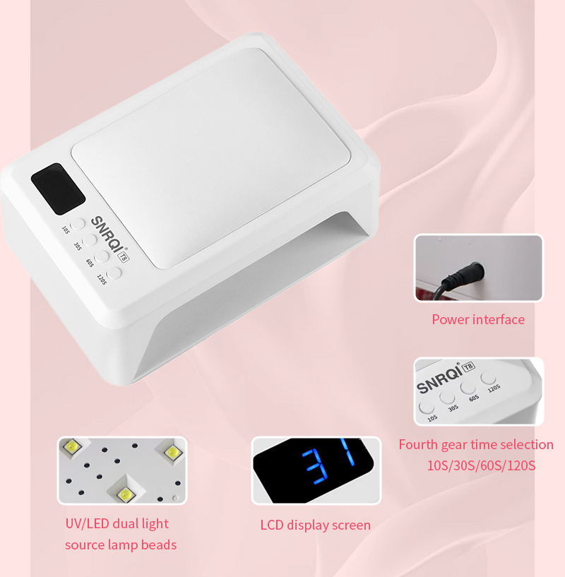 Produktet sikrer jevn limtørking uten krymping. De doble lyskildene gir skånsom oppvarming for å forhindre misfarging av hender og belastning på øynene, egnet for både hender og føtter, og gir bemerkelsesverdig raskt tørkende resultater.