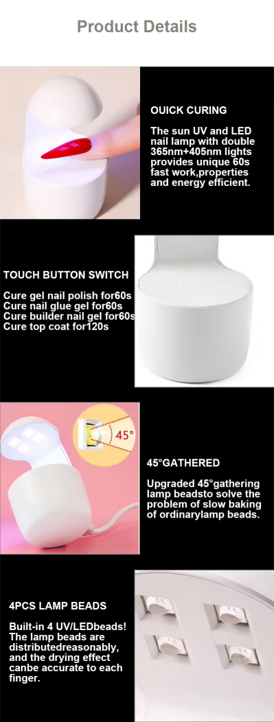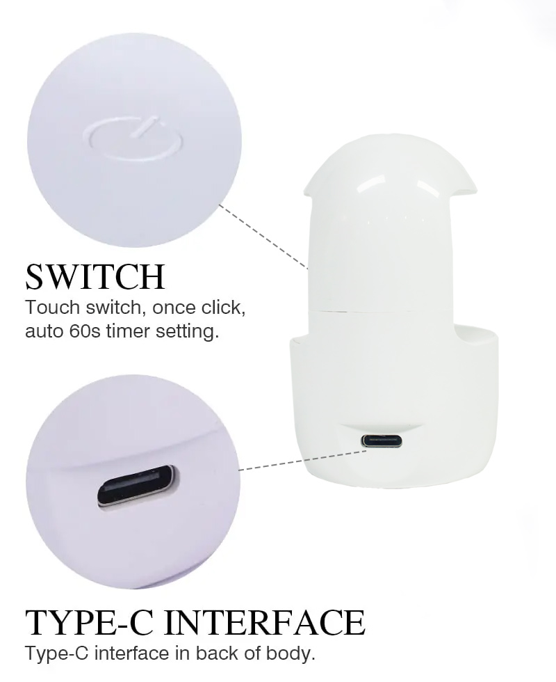 Mini One-Finger Nail Lamp sikrer jevn limtørking uten å krympe. De doble lyskildene gir skånsom oppvarming for å forhindre misfarging av hender og belastning på øynene, egnet for både hender og føtter, og gir bemerkelsesverdig raskt tørkende resultater.