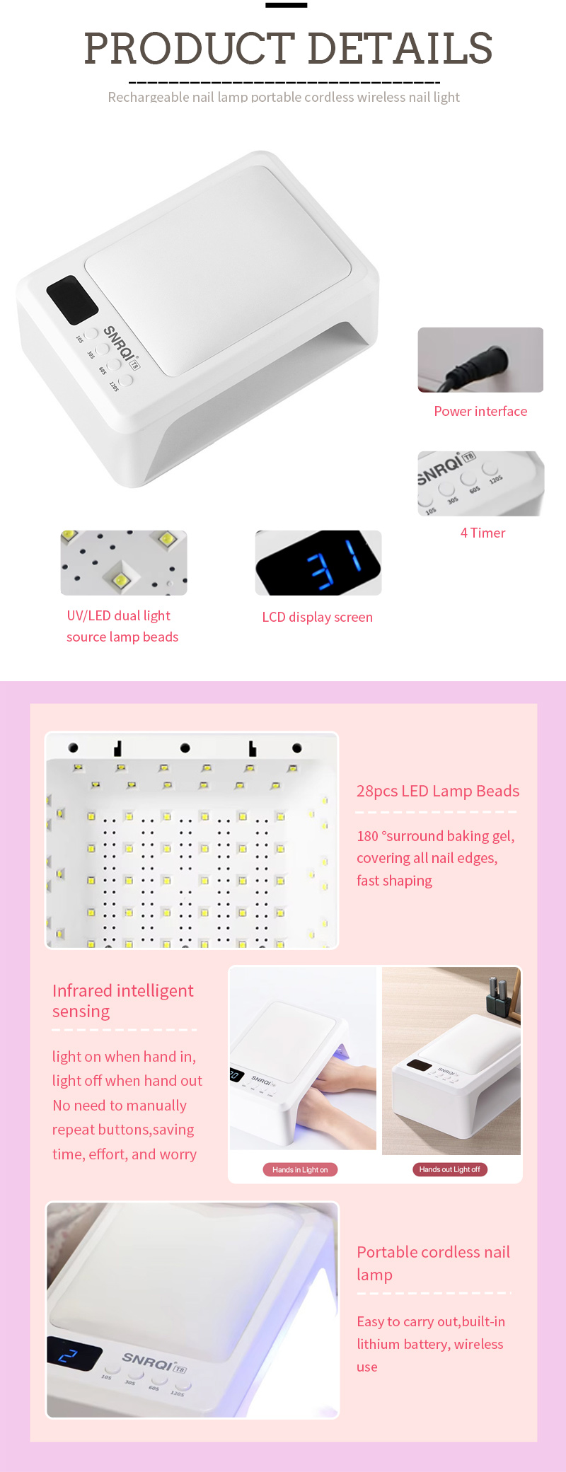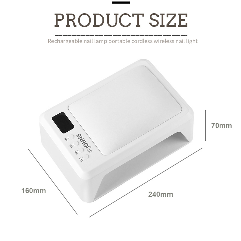 Oppladbar neglelakk Lampe Profesjonell versjon 128W Produktutseende har en groove -design, håndtaket i sporet kan brukes som en bærbar håndtakrolle, noe som gjør det mer praktisk å bære og sette. Det unngår også ulempen med at håndtaket lett blir ødelagt og trakk løs.