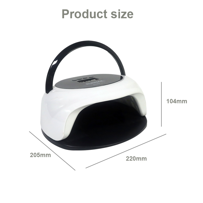 Dimensjonene på spikertørkelampen med automatisk sensorfunksjon er 205 mm i lengde, 220 mm i bredden og 104 mm i høyden, med stor kapasitet og mulighet til å bruke både hender og føtter, noe som er veldig praktisk.