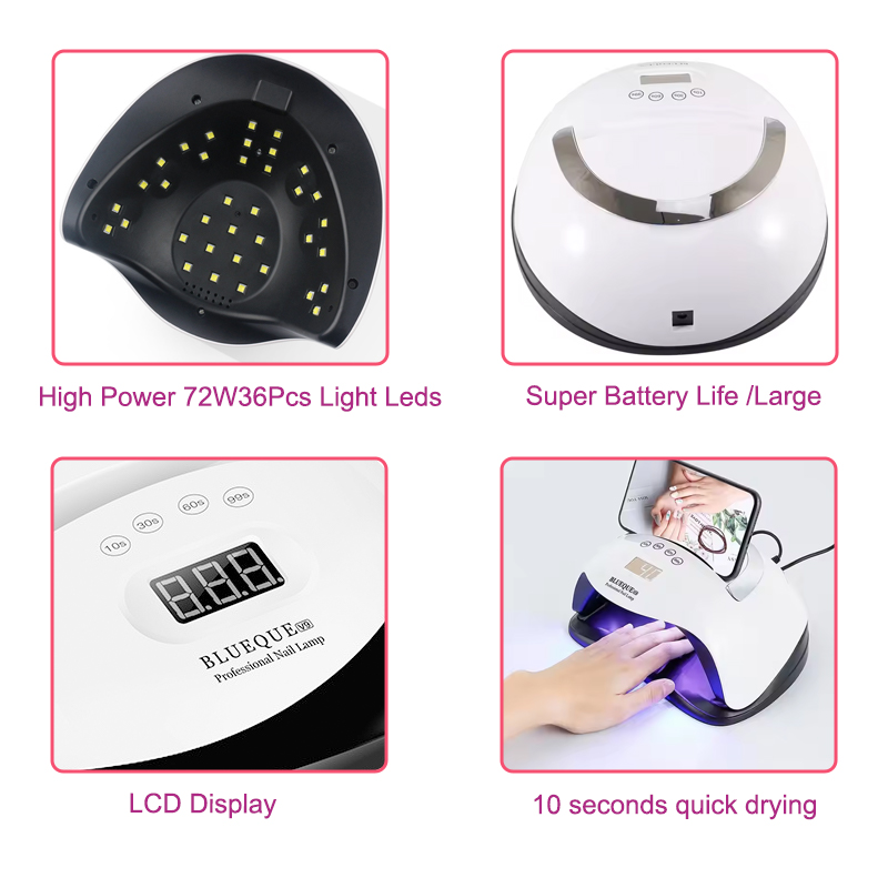 Produktet sikrer jevn limtørking uten krymping. De doble lyskildene gir skånsom oppvarming for å forhindre misfarging av hender og belastning på øynene, egnet for både hender og føtter, og gir bemerkelsesverdig raskt tørkende resultater.