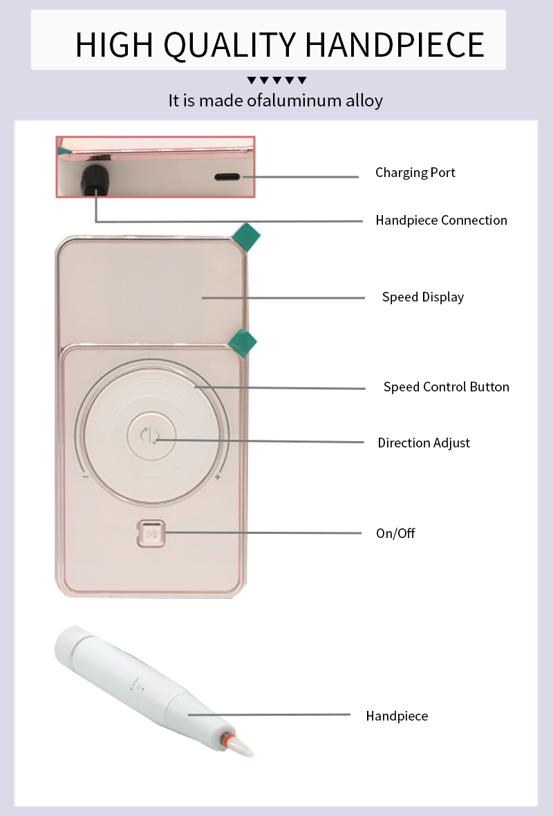 Denne høyhastighets og støysvake slipepenn-displaydesignen, med slipepennsokkel, LCD flytende krystall-display kan vise antall omdreininger/effekt/retning, hastighetsbryterknapp, bryterknapp med klokken/mot klokken, pauseknapp, 30 000 rpm profesjonell motor, innskrudd låseslipehode.
