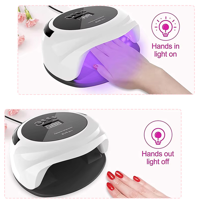 Produktet sikrer jevn limtørking uten krymping. De doble lyskildene gir skånsom oppvarming for å forhindre misfarging av hender og belastning på øynene, egnet for både hender og føtter, og gir bemerkelsesverdig raskt tørkende resultater.