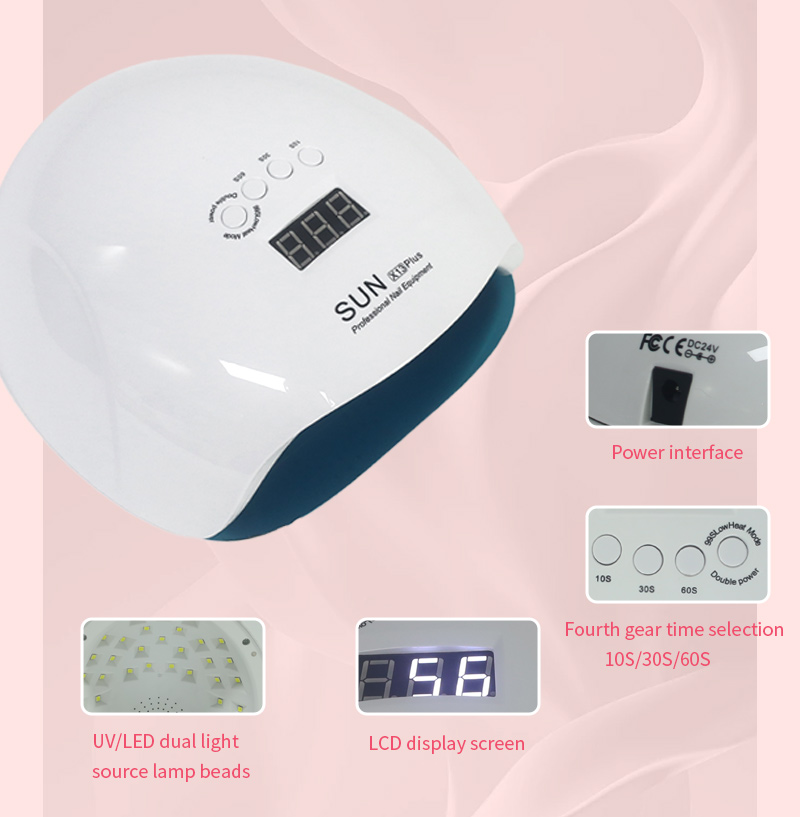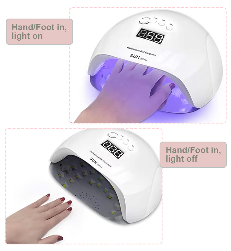 Produktet sikrer jevn limtørking uten krymping. De doble lyskildene gir skånsom oppvarming for å forhindre misfarging av hender og belastning på øynene, egnet for både hender og føtter, og gir bemerkelsesverdig raskt tørkende resultater.