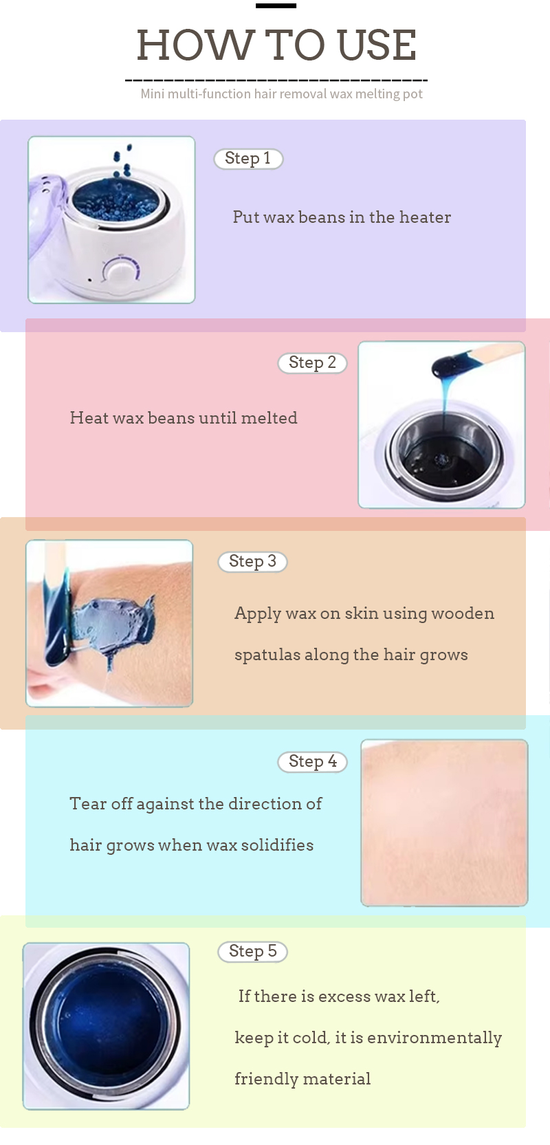 Produktet hårfjerningsvoks operasjonsmetode, jo høyere temperatur jo raskere voksen smelter, jo lavere temperatur, jo langsommere smelter voksen, hell først i passende mengde hårfjerningsvoksbønner, varm opp til voksbønnene smelter, deretter hårfjerningsdeler av den jevnt belagte hårvekst, og til slutt rives av mot hårvekstretningen.