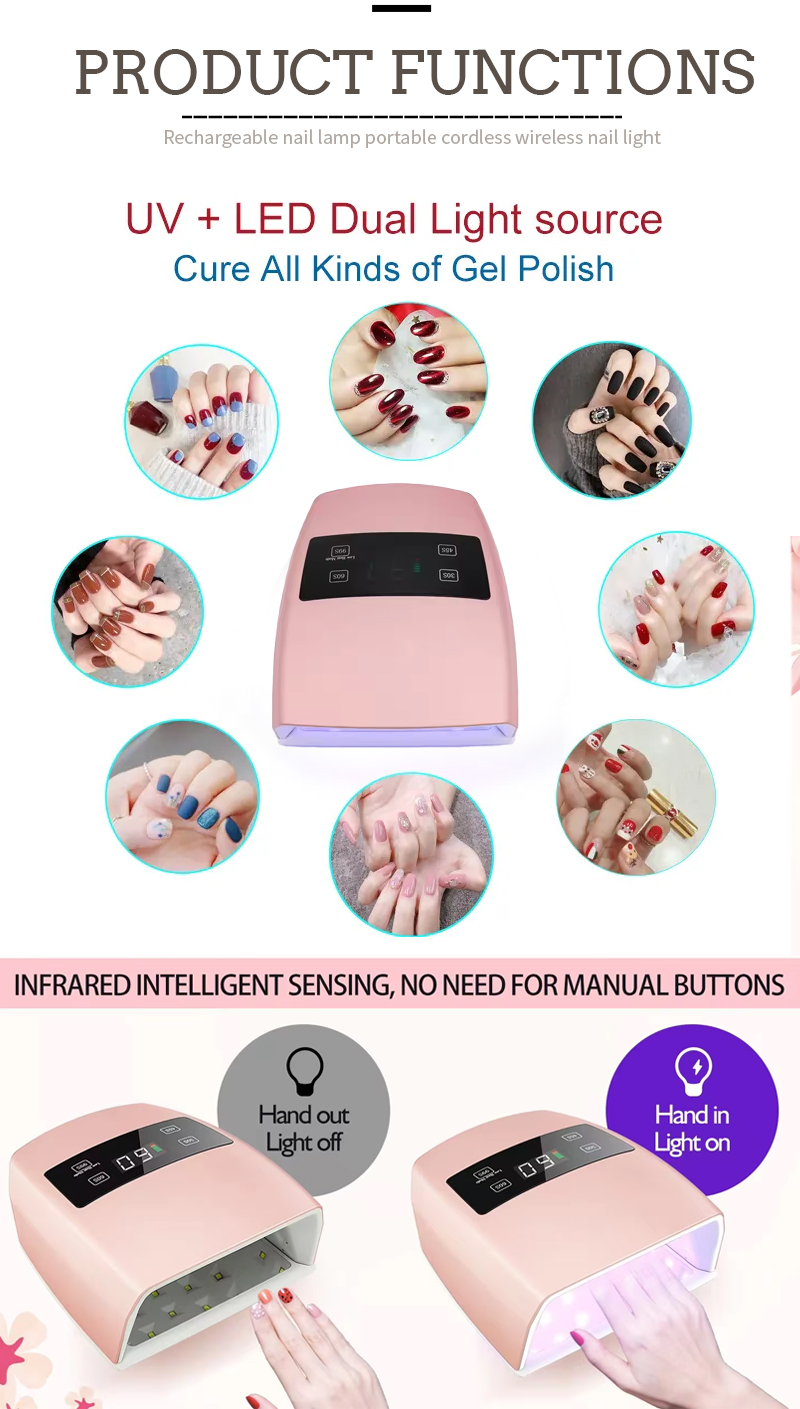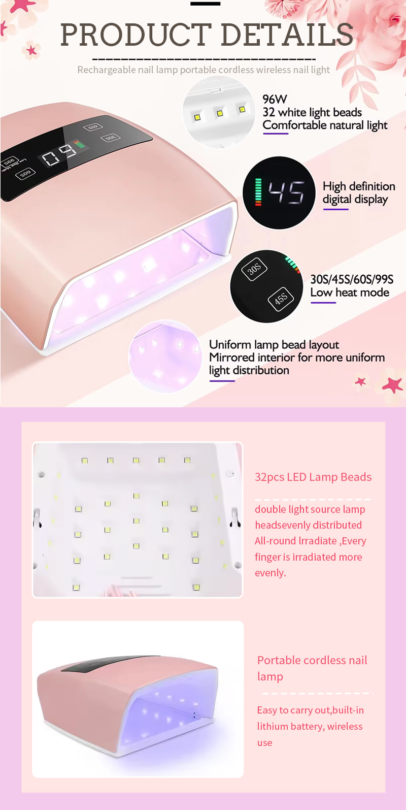 Produktet sikrer jevn limtørking uten krymping. De doble lyskildene gir skånsom oppvarming for å forhindre misfarging av hender og belastning på øynene, egnet for både hender og føtter, og gir bemerkelsesverdig raskt tørkende resultater.