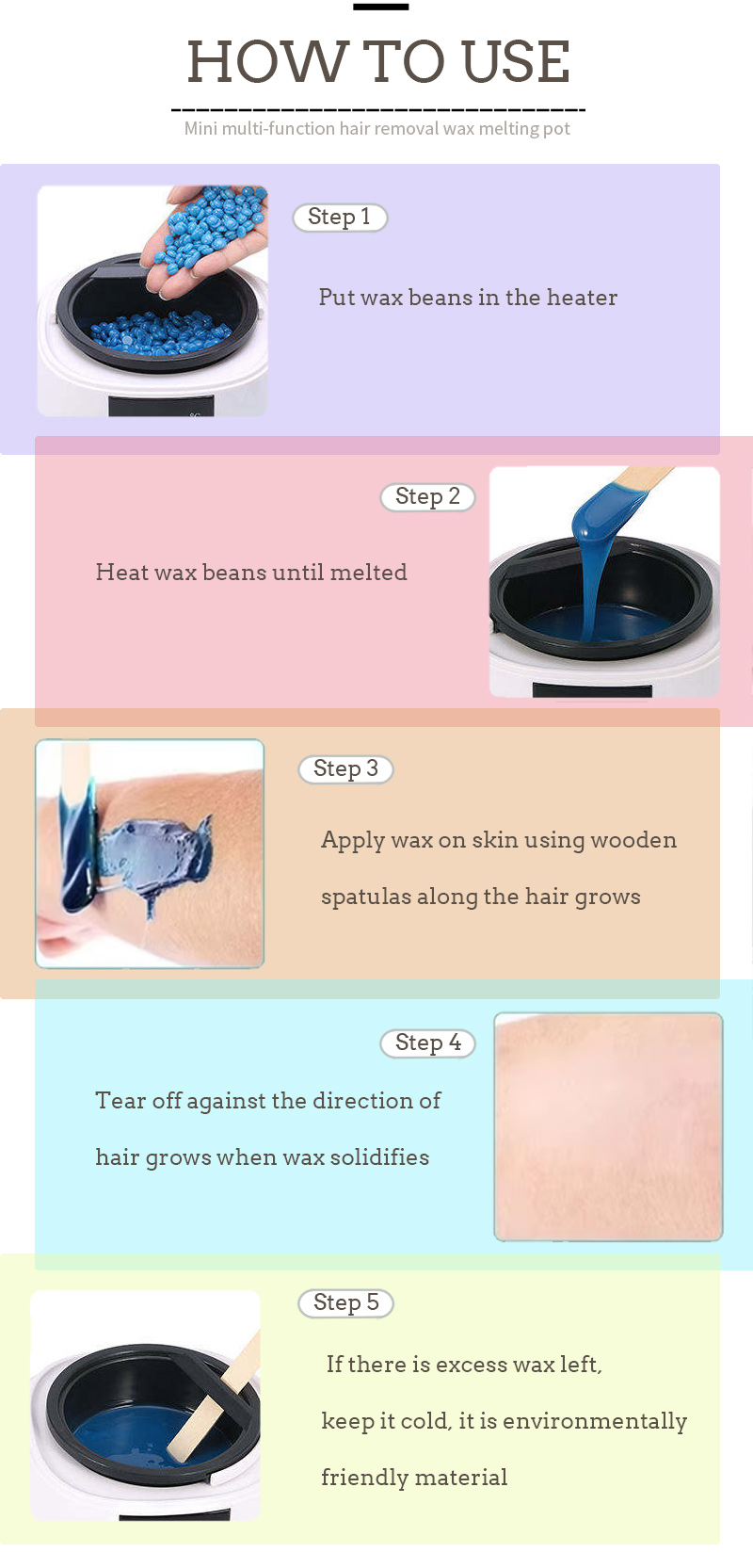 Produktet hårfjerningsvoks operasjonsmetode, jo høyere temperatur jo raskere voksen smelter, jo lavere temperatur, jo langsommere smelter voksen, hell først i passende mengde hårfjerningsvoksbønner, varm opp til voksbønnene smelter, deretter hårfjerningsdeler av den jevnt belagte hårvekst, og til slutt rives av mot hårvekstretningen.