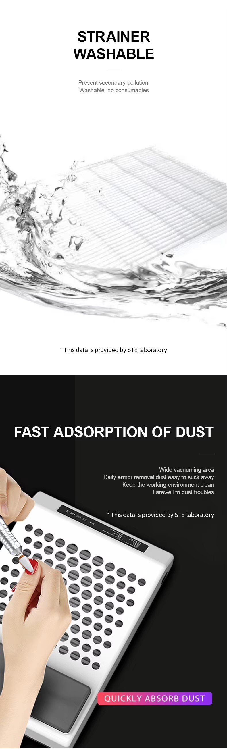 Produkter Sterk adsorpsjon av neglesrester lekker ikke støv, holder benkeplaten ren og ryddig, rask støvsuging lekker ikke støv med høy effekt.